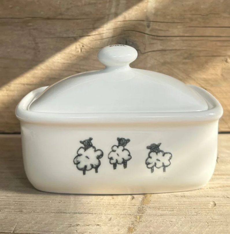 Desgl dal menyn, tjeina gyda chynllun defaid. Baa wedi ‘sgrifennu ar y botwm top. Gwnaed yng Nghymru